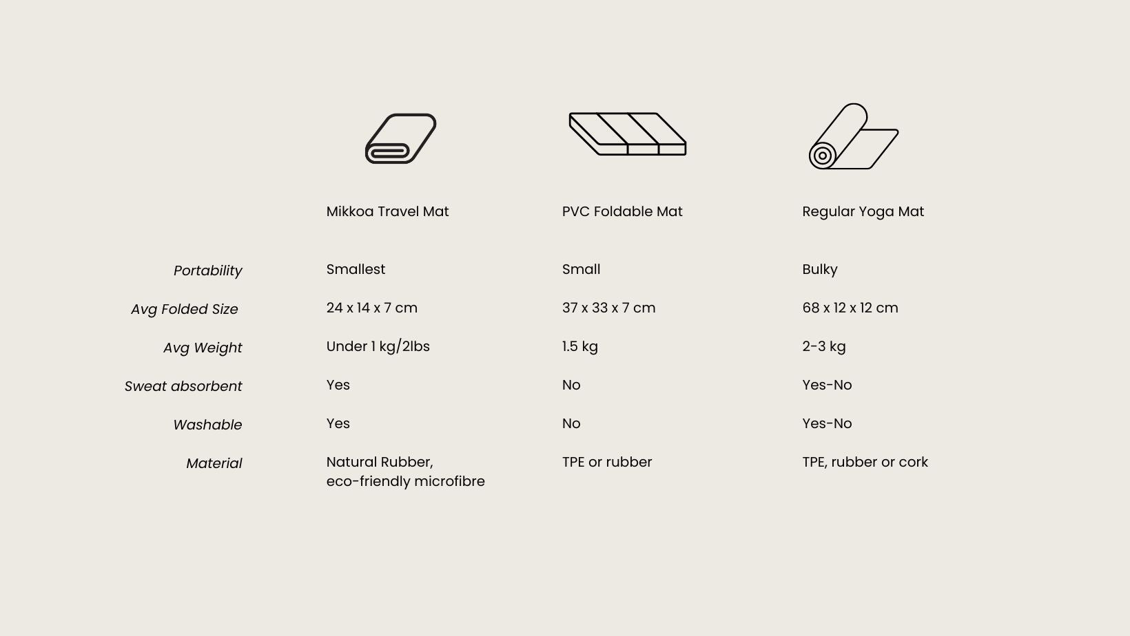 Compact, neemt 1/3 van de ruimte van een gewone yogamat in beslag.